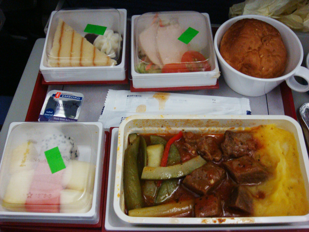 機上晚餐:牛肉馬鈴薯泥,個人不是很喜歡馬鈴薯泥,但配著牛肉一起吃還行,旁邊的蔬菜味道有點怪異