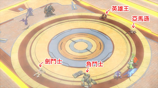 受到恐龍軍團攻擊時,英雄王和劍鬥士在一起,角鬥士則和亞馬遜戰士在一起