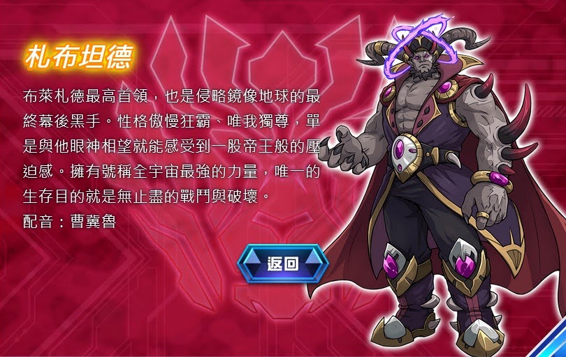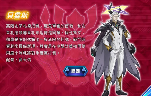 反派組織布萊札德最高領導者的名字在第五彈曾經揭露過,副首領貝魯斯的人物介紹提及:與首領「劄布坦德」是同輩