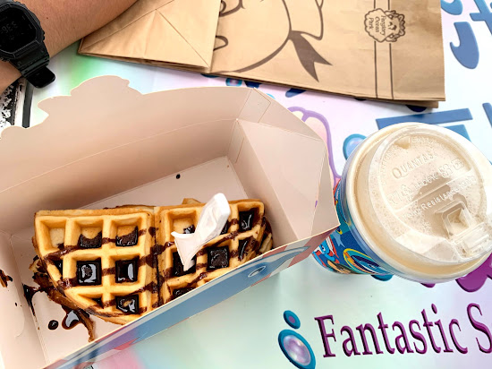 鮮奶想吃點心,因此我們步行到最接近園區入口的燈塔鬆餅屋,買了鬆餅後再次搭乘纜車到水晶城堡園區,一邊吃一邊等開演。