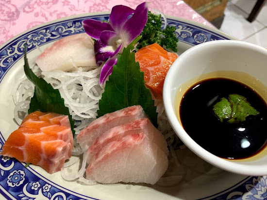 離開海洋公園後,本來想去網路推薦的一家055海鮮餐廳吃飯,但人太多了。想改去附近的另一家十分之一海鮮,但是也客滿了。於是來到這家海鮮餐廳,原本也滿了,不過還好很快就有位子。點了生魚片跟炒地瓜葉,生魚片$280有12片,鮮奶說跟爭鮮相比算是新鮮。