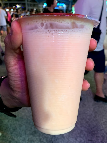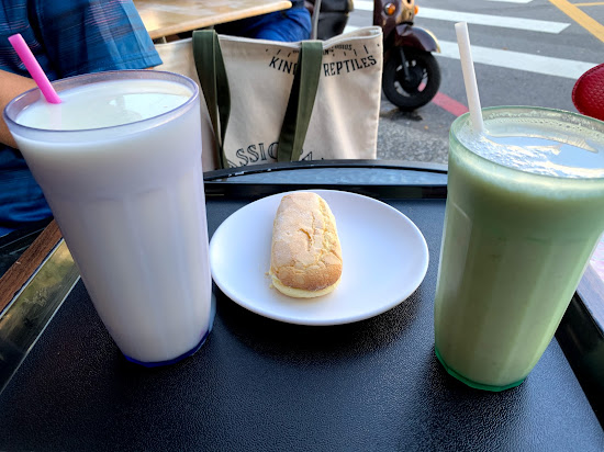 鮮奶覺得杏仁豆漿(左)太淡因此不喜歡,綠豆沙牛奶(右)還不錯。
