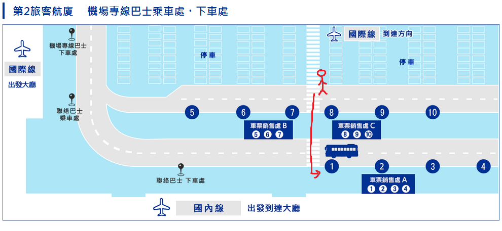 樂桃在關西機場第二航廈,出關跟領行李的速度都滿快的,走出航廈之後就可以看到利木津巴士站的指標,我們要搭巴士到梅田地區,因此要走到1號站牌的位置。